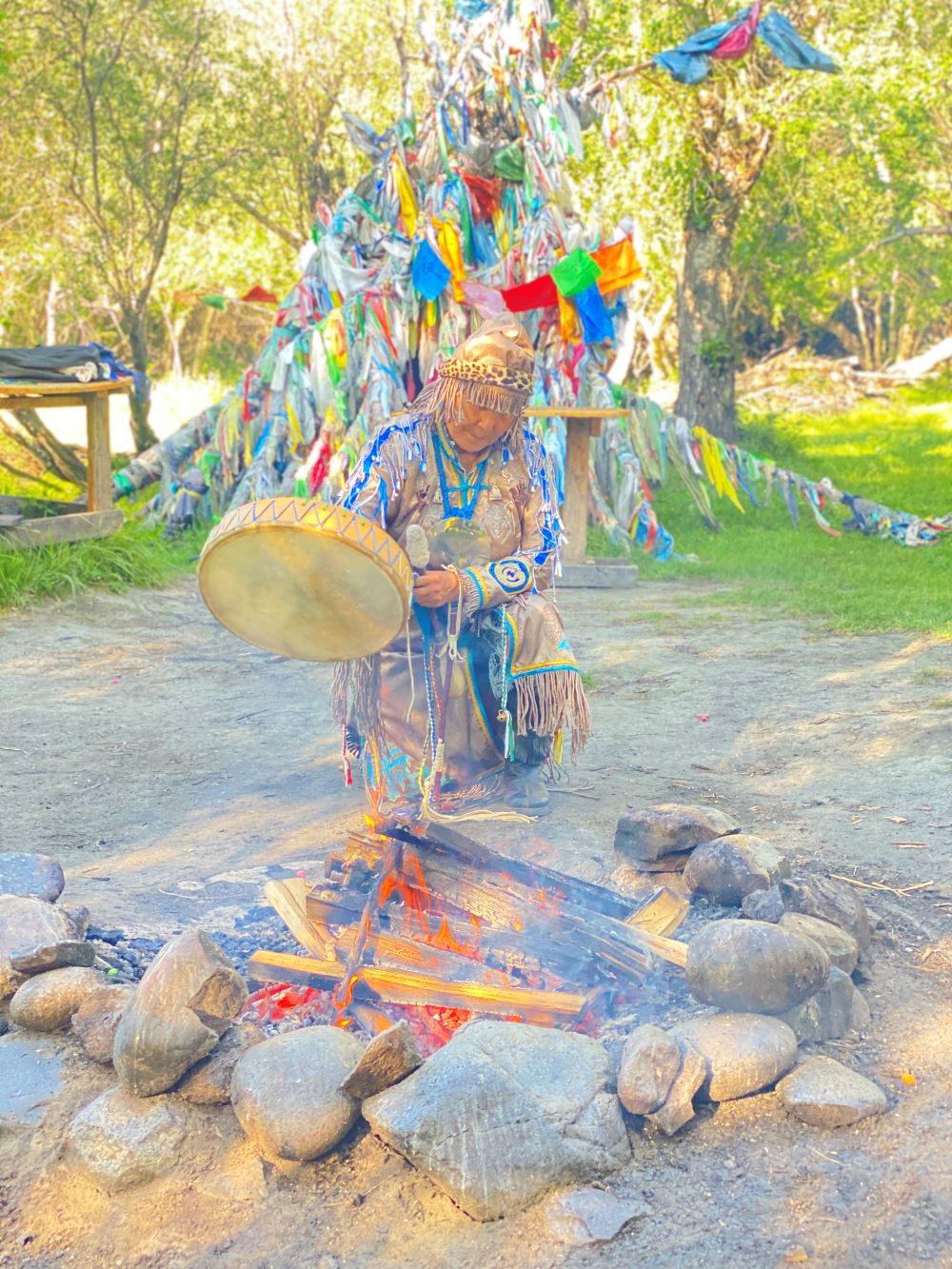 Gezimiz esnasında Başkent Kızıl’da bir ‘Şaman Kliniği’ne uğruyoruz. Hastalar oraya gelip tedavi görüyor, sadece bedenlerini değil, ruhlarını da şifalandırıyorlar. Bizi karşılayan Şaman Ludmilla, kliniği dolaştırıp bilgi verdikten sonra, aracımıza geri dönüp “Şaman Töreni” için buluşacağımız yöreye gidiyoruz. Akşamüstü... Bir dere kenarı, ağaçlıklı bir meydan… Ve alanın ortasında yanan bir ateş… Banklara yerleşiyoruz ve Ludmilla ateşin etrafında dönüyor, dönüyor ve davulunu ritmik biçimde çalmaya başlıyor; bu ses hem kendisini hem dinleyicileri transa sokuyor… Şaman ruhsal bir yolculuğa çıkıyor — kimi zaman göğe, kimi zaman yeraltına… Her birimize yaklaşıp, rahatsız olduğunu hissettiği bir yaşlıyı seçip onun şifa bulması için ateşe adaklar sunarak tavafını sürdürüyor… Dağın, akarsuyun, ağacın, atalarının koruyucu ruhlarından yardım diliyor…