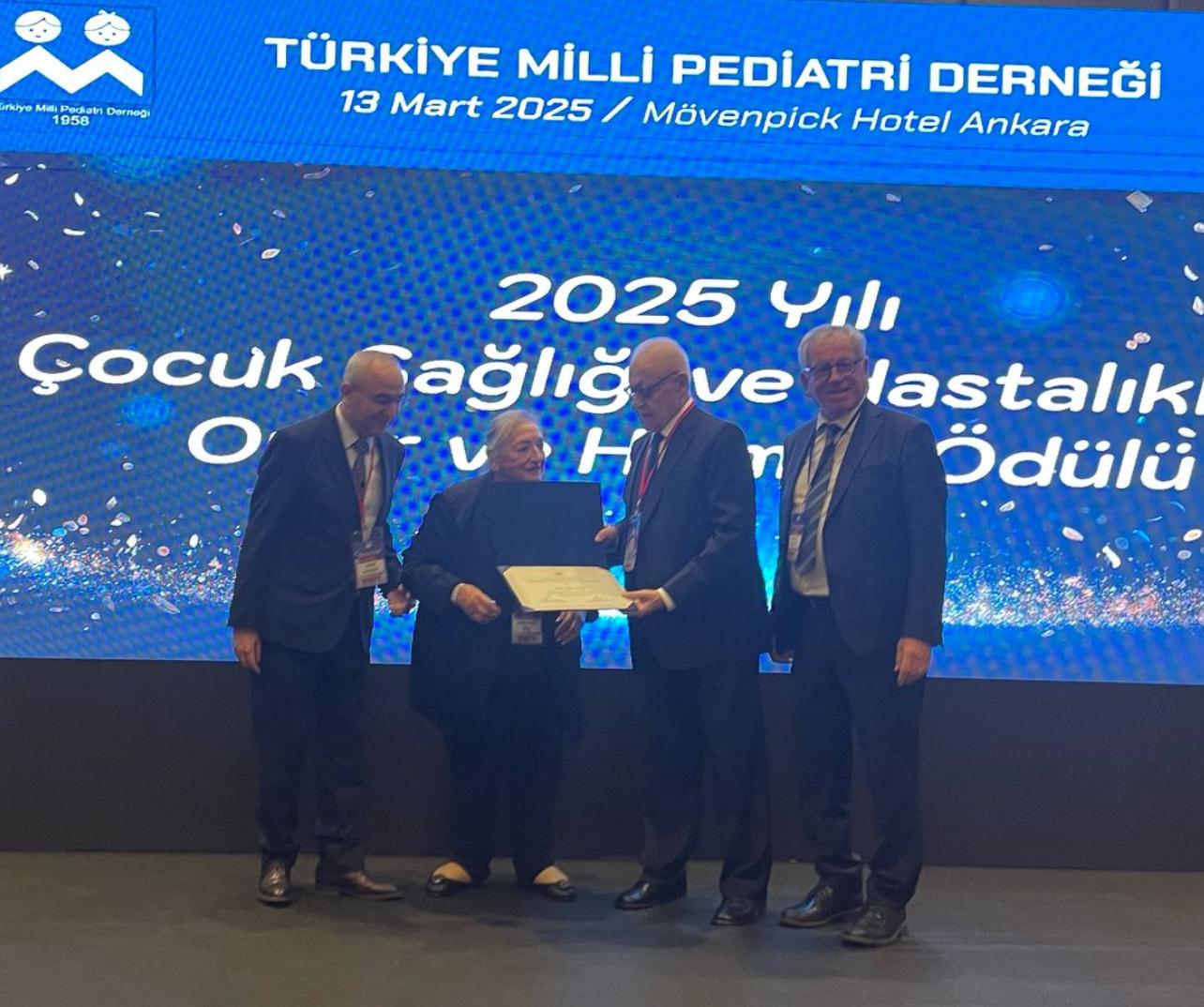 Türkiye Milli Pediatri Derneği tarafından “Çocuk Sağlığı ve Hastalıkları Onur ve Hizmet Ödülü”ne layık görülen Prof. Dr. Ülker Öneş’e sertifikası takdim edilirken (2025)