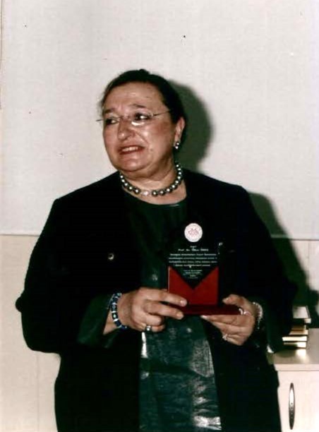 Prof. Dr. Ülker Öneş, Ana Bilim Dalı Başkanlığı döneminde açılışını yaptığı “Kekemelik Merkezi” için kendisine verilen plaketle (2002)