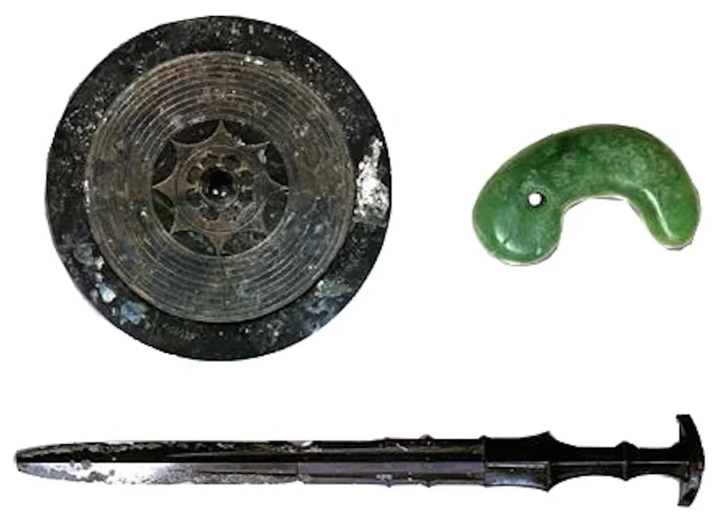 - Japonya İmparatorluk ailesinin üç kutsal hazinesi efsanevi bir statüye sahip olduğu için konumları tam olarak teyit edilememiştir. Bu objeler bilgeliğin sembolü ayna, cesaretin sembolü kılıç, merhametin sembolü olan mücevherdir. Japon geleneğine göre bu üç erdeme sahip olan gerçek hükümdardır.
