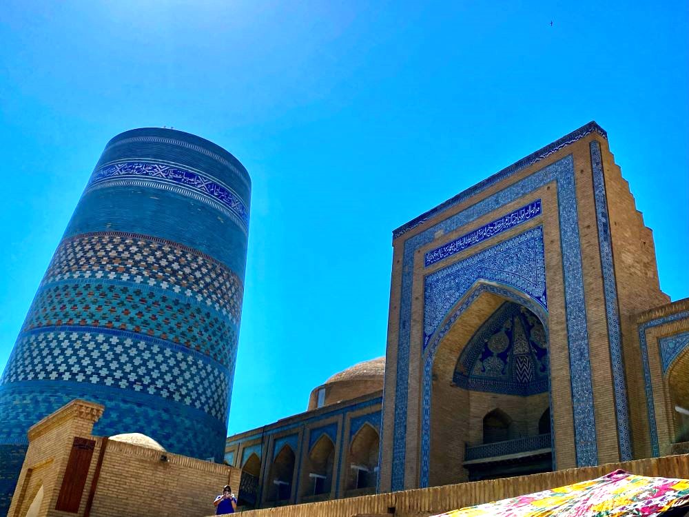 Batı Kapısından girdikten hemen sonra, Orta Asya’nın en büyük medreselerinden biri olan Muhammed Âmin Han Medresesi bizi karşılıyor. 1850-1854 yılları arasında Muhammed Âmin Han tarafından yaptırılan medrese en çok yarım kalan minaresi ile ilgi çekiyor ve anılıyor. Buhara ziyaretinde çok beğendiği bir minareye özenip ondan daha yükseğini inşa ettirmek isteyen Han, medrese inşaatı başladıktan bir süre sonra savaşa katılmış ve hayatını kaybetmiş. Bu nedenle medresenin minaresi yarım kalmış; 80 metre olması planlanan minare 26 metre yüksekliğe sahip. Üzerindeki çini işlemeler oldukça göz alıcı. Günümüzde şehrin simgelerinden biri haline gelen ve yarım kalan minare ile ilgili, çeşitli hikâyeler anlatılmaya devam ediliyor.