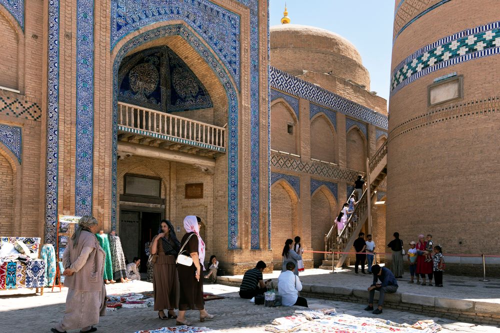 1908 yılında yapılan ve Hiva’nın her noktasından görülen İslam Khoja Minaresi’nin ve İslam Hoca Medresesi’nin bulunduğu İçhan Kale’nin merkezinde bulunan meydanı satıcılar mesken tutmuş. En çok Özbekistan’a has kalpakların satışının yapıldığı tezgâh ilgi çekiyor. Bu kalpakların sosyal statüyü anlatmak için de kullanıldığını anlatan rehberimiz, her birinin hikâyesini ayrı ayrı özetliyor.