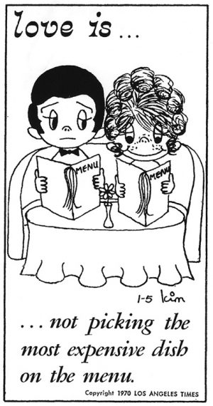 Kim Casali’nin Los Angeles Times’da yayınlanan ilk karikatürü (“Aşk, menüdeki en pahalı yemeği seçmemektir”); Kaynak: loveiscartoon.com