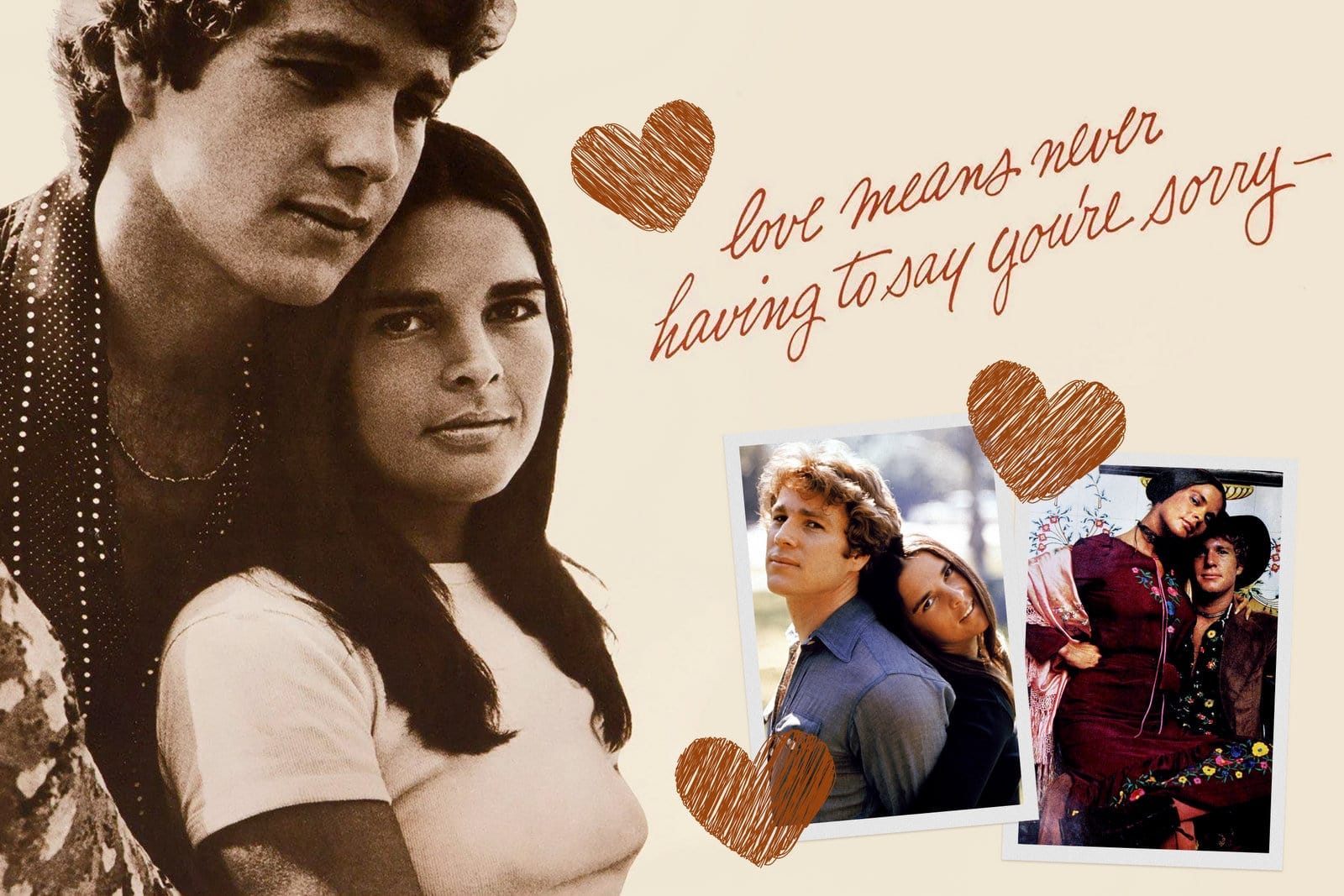 “Love Story” filminin başrol oyuncuları (Ali MacGraw ve Ryan O'Neal) ve filmin ünlü repliği: "Aşk, asla özür dilemek zorunda kalmamaktır"