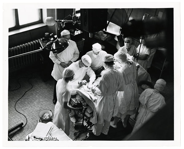 1947’de yapılan bir “Mavi Bebek” ameliyatı. Vivien Thomas solda, lambanın arkasında duruyor ve Dr. Blalock’u ameliyatta yönlendiriyor